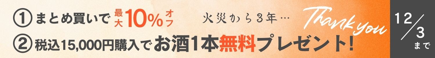 【最大10%オフ】火災から3年感謝キャンペーン開始! おまとめ買い&お酒が1本無料でついてくる!< 11/27(木) 〜 12/3(水)>