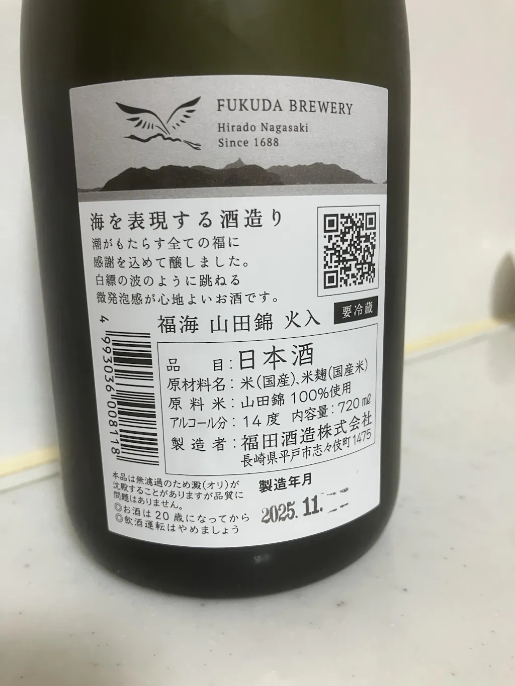 元禄元年(1688年)創業。創業者の福田長治兵衛門氏の「酒造りは、心でつくり、風が育てる」という言葉が今も息づく港町平戸市の志々伎町に蔵は立ちます。15代目蔵元の福田竜也氏は、「平戸の南、志々伎湾は世界中ここにしかない、貴重な美しい海」であり、この海を表現する日本酒を造ろうと、伝統を守りながらも新しいことに挑戦されています。搾りたての日本酒にストレスをかけることなく無濾過の原酒で、丁寧に瓶詰すること、そして瓶詰後は速やかに瓶燗火入れを施すことで、きめ細やかな微発泡感が生み出されています。その味わいは、繊細かつダイナミックさも持ち合わせる唯一無二の志々伎湾を表現する日本酒。海の幸を合わせるために生まれたともいえるその軽やかさの中にも芯の通った味わいは、代表銘柄「福田」から「福海」へとリブランディングされて、より一層輝きを放ち始めました。平戸の海水から海洋性乳酸菌の研究を行うなど、今後の展開から目が離せません。